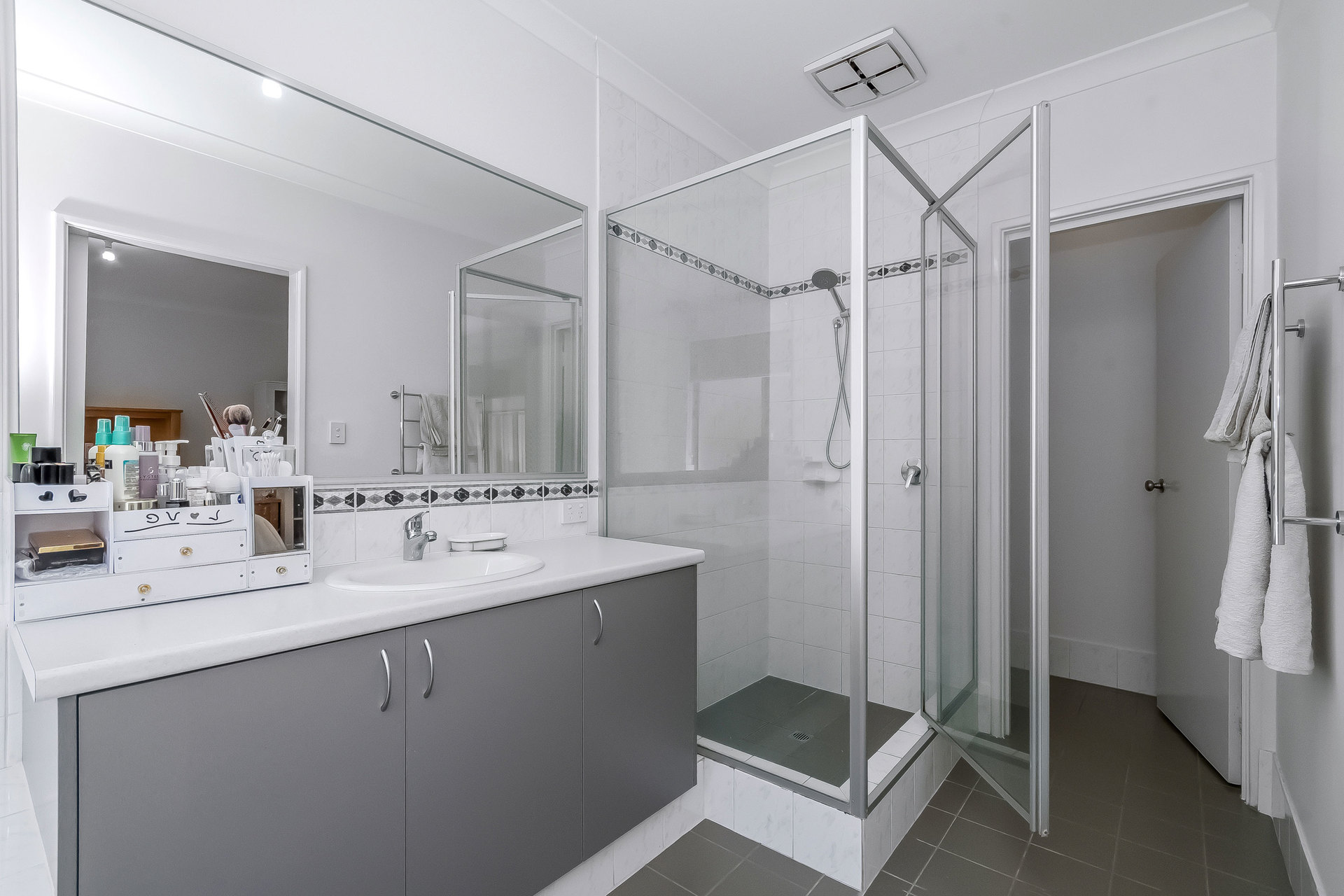The spacious master bedroom is a luxurious retreat with a walk-in robe and a modern ensuite featuring a glass screen shower and a relaxing spa bath. The three additional bedrooms are generously sized, each with built-in robes, and share a second bathroom that includes a glass-screen shower and bathtub for family convenience.