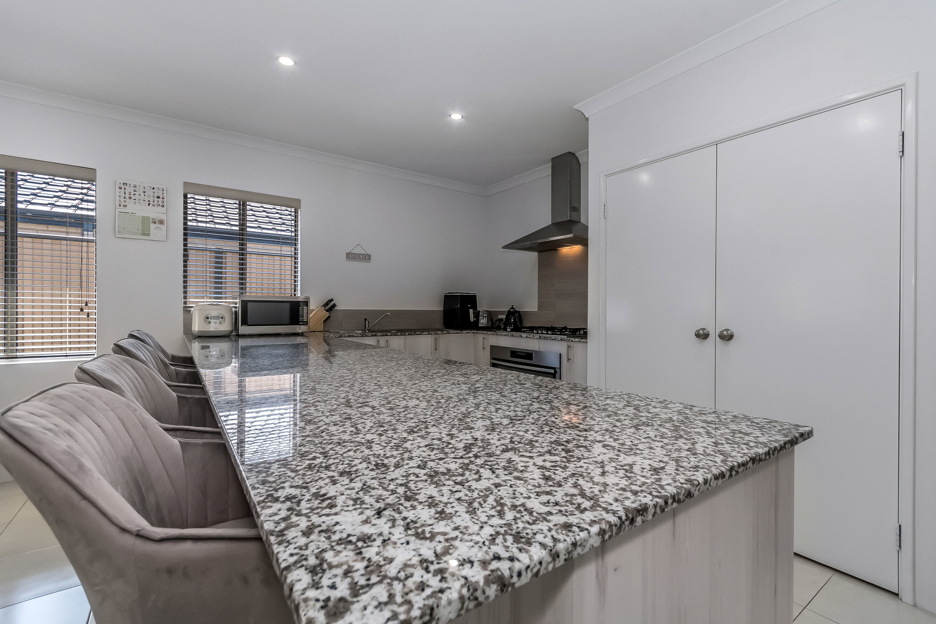 Home chefs will be delighted with the large modern kitchen, boasting quality 900mm stainless steel appliances, dishwasher, ample storage with and abundance of cupboards and drawers, plus luxurious stone benchtops and breakfast bar. The kitchen overlooks the expansive open-plan meals and family room, complete with downlights, providing the perfect space for entertaining.