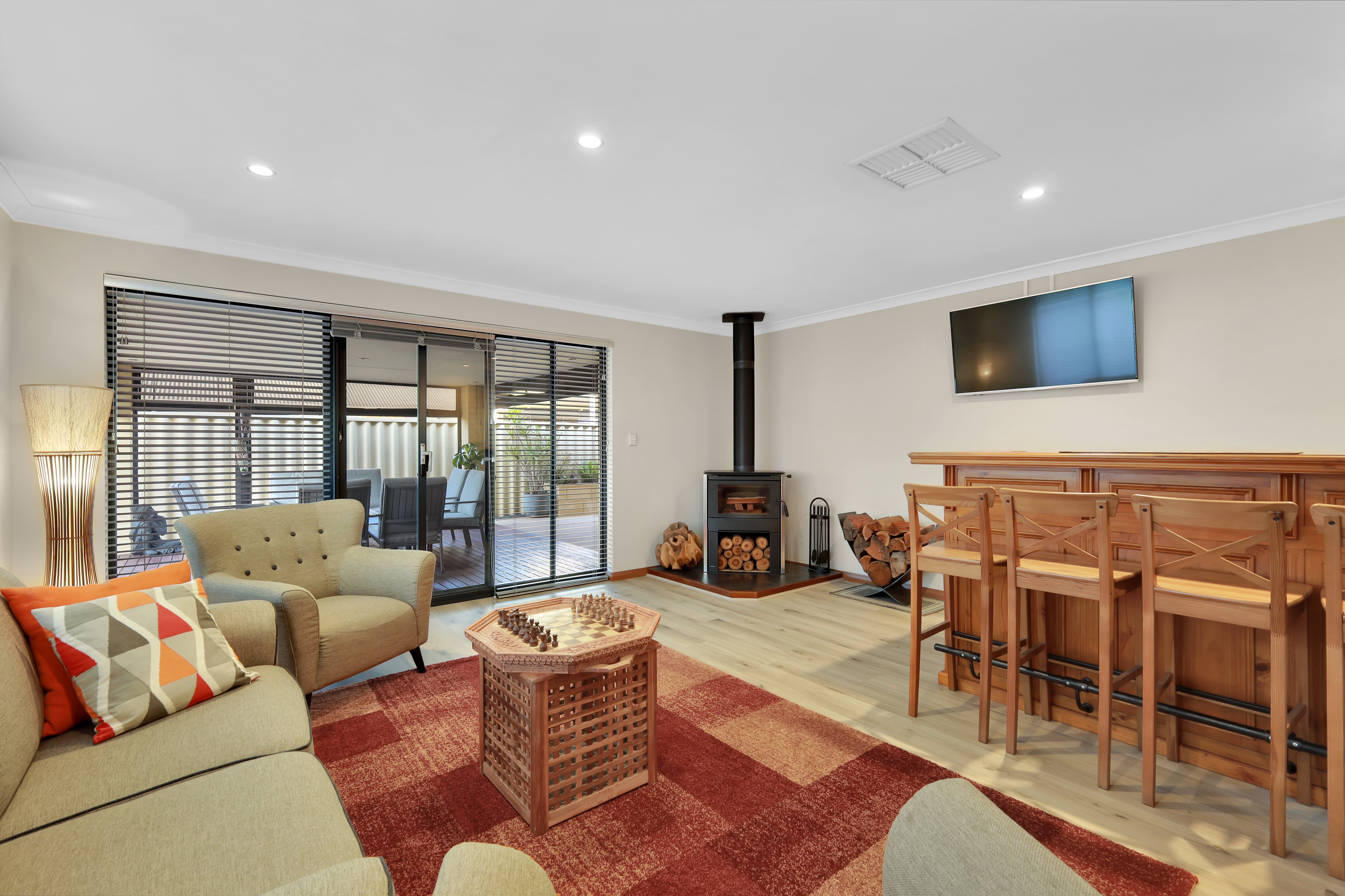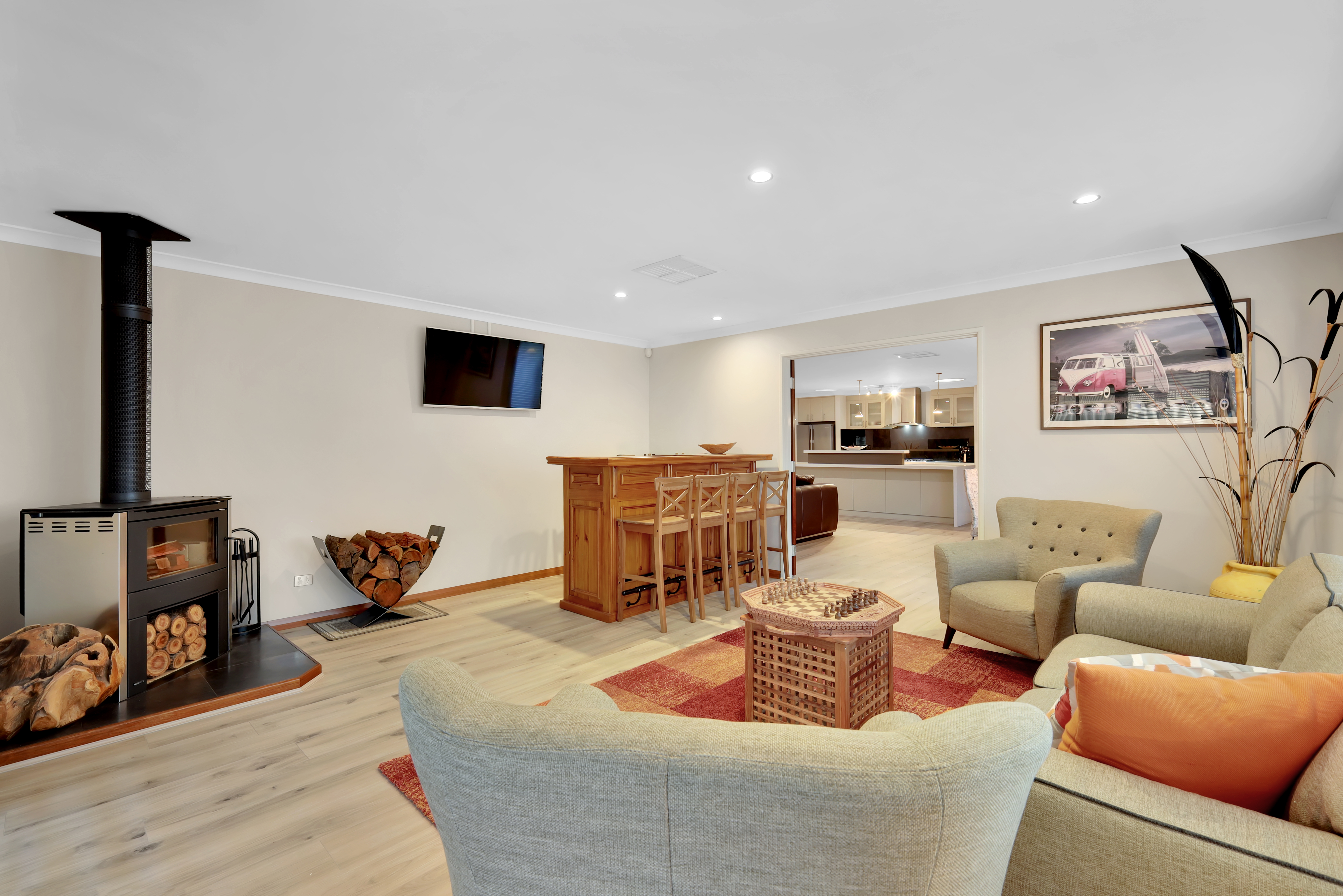 Games room/ Man Cave: This inviting room, perfect for entertaining or relaxing, features a cozy wood-burning fireplace, adding warmth and ambience. A stylish bar provides the ideal setting for hosting friends and family. The room is designed with comfortable seating and a mounted TV, making it perfect for casual gatherings or quiet evenings.
