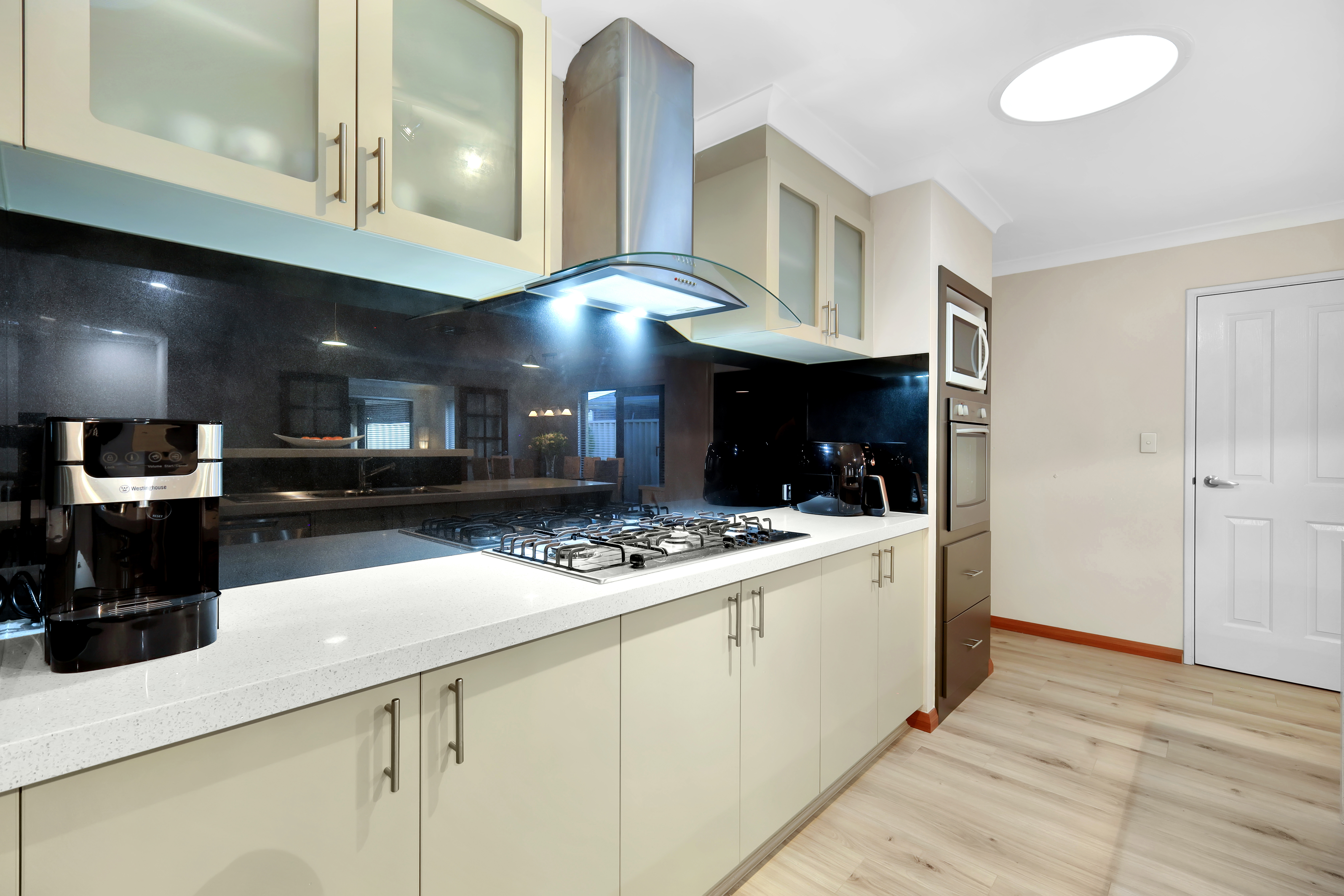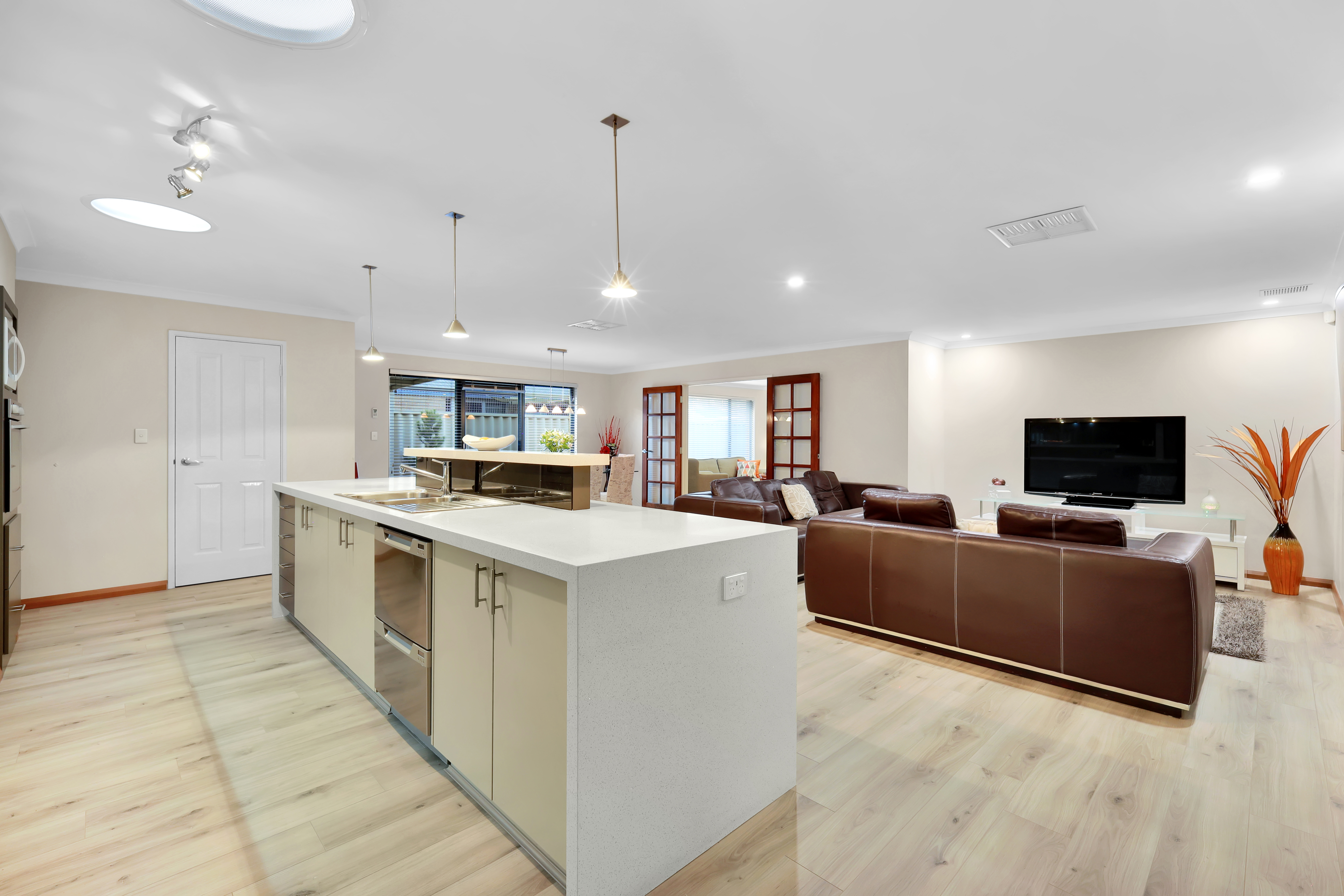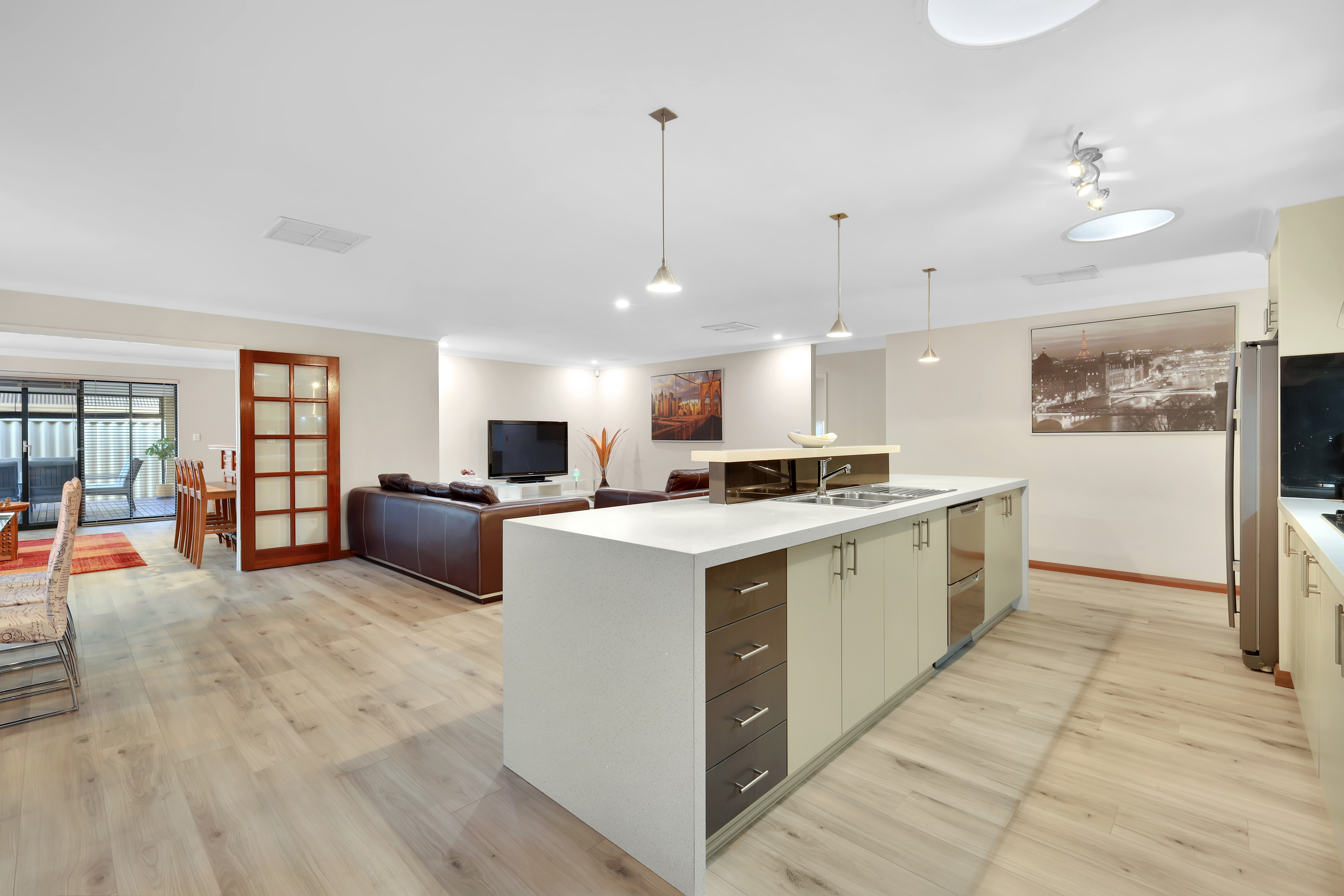 Large Modern Kitchen For the family chef, this spacious kitchen is a dream come true. Featuring elegant pendant lights, stainless steel appliances, a striking stone benchtop with a waterfall edge, overhead cupboards, a double-drawer dishwasher, a microwave recess, and a generous fridge space. This kitchen flows effortlessly into the living and dining areas, offering the perfect layout for entertaining while preparing meals.