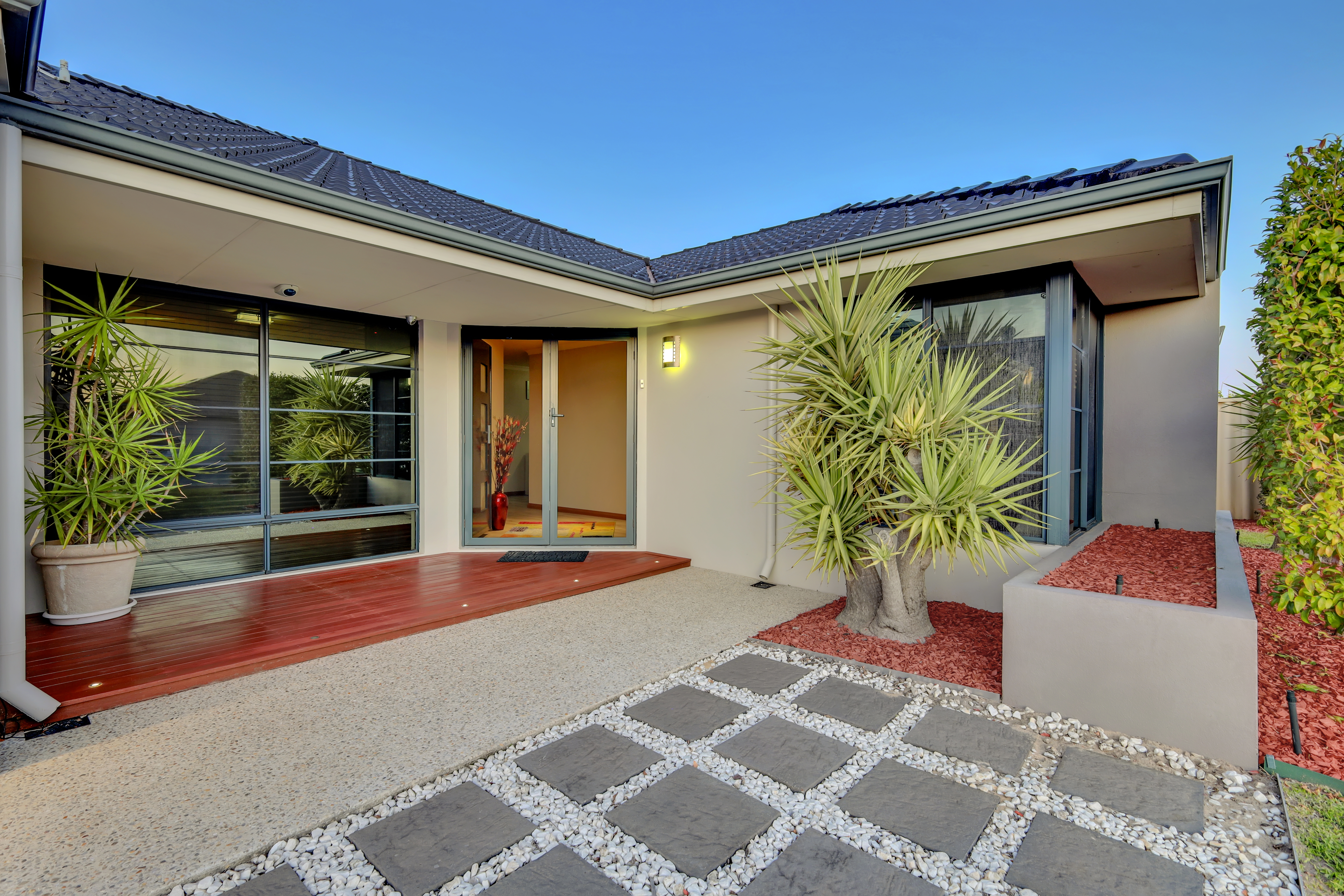 Frontage The frontage of this house features a beautifully landscaped garden with vibrant green grass and meticulously arranged succulents. A neat, paved walkway leads to the modern entrance, complemented by a stylish wooden deck at the porch. The wide exposed aggregate driveway leads to the double garage, featuring a contemporary wooden door design, adding a touch of sophistication to the overall look.