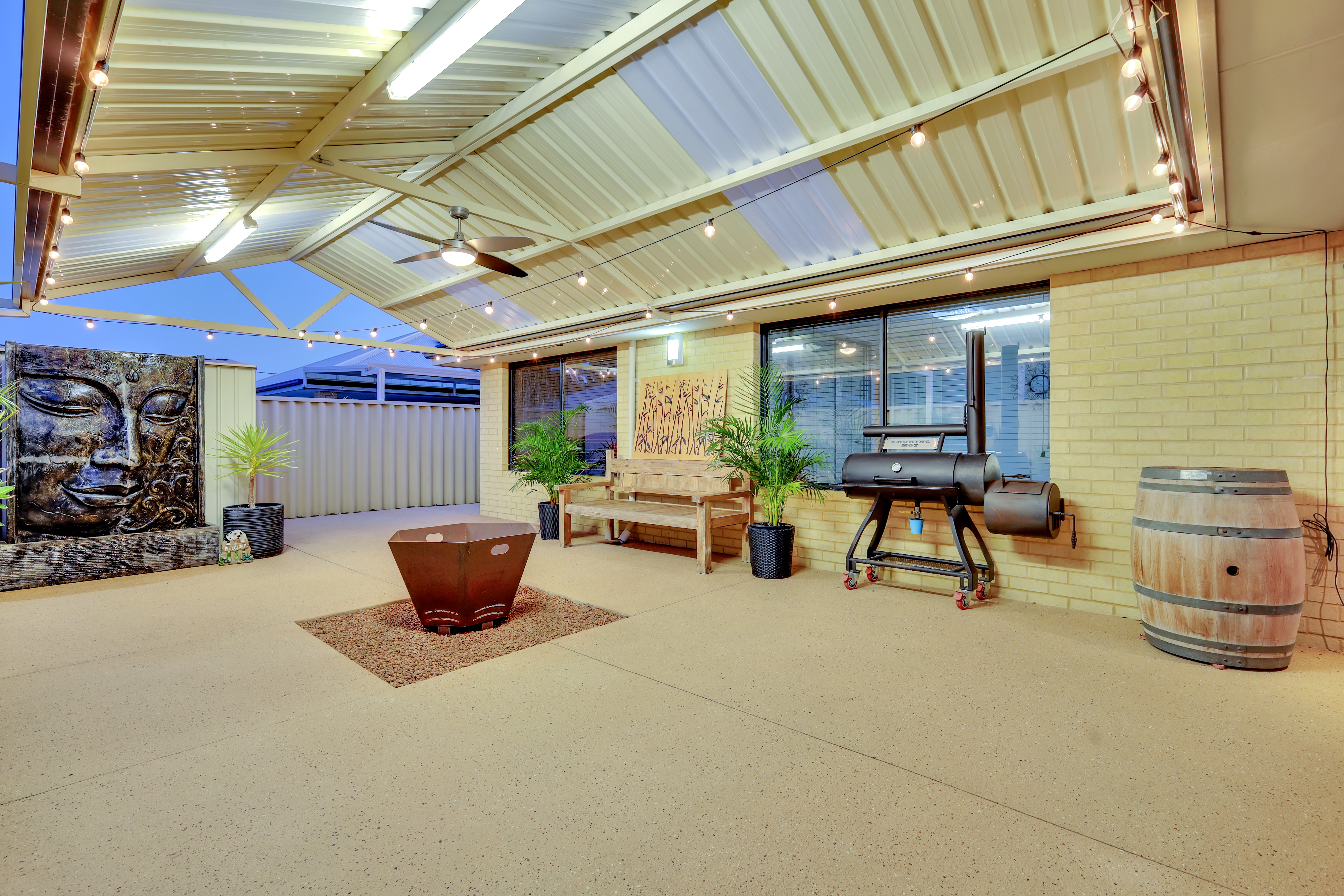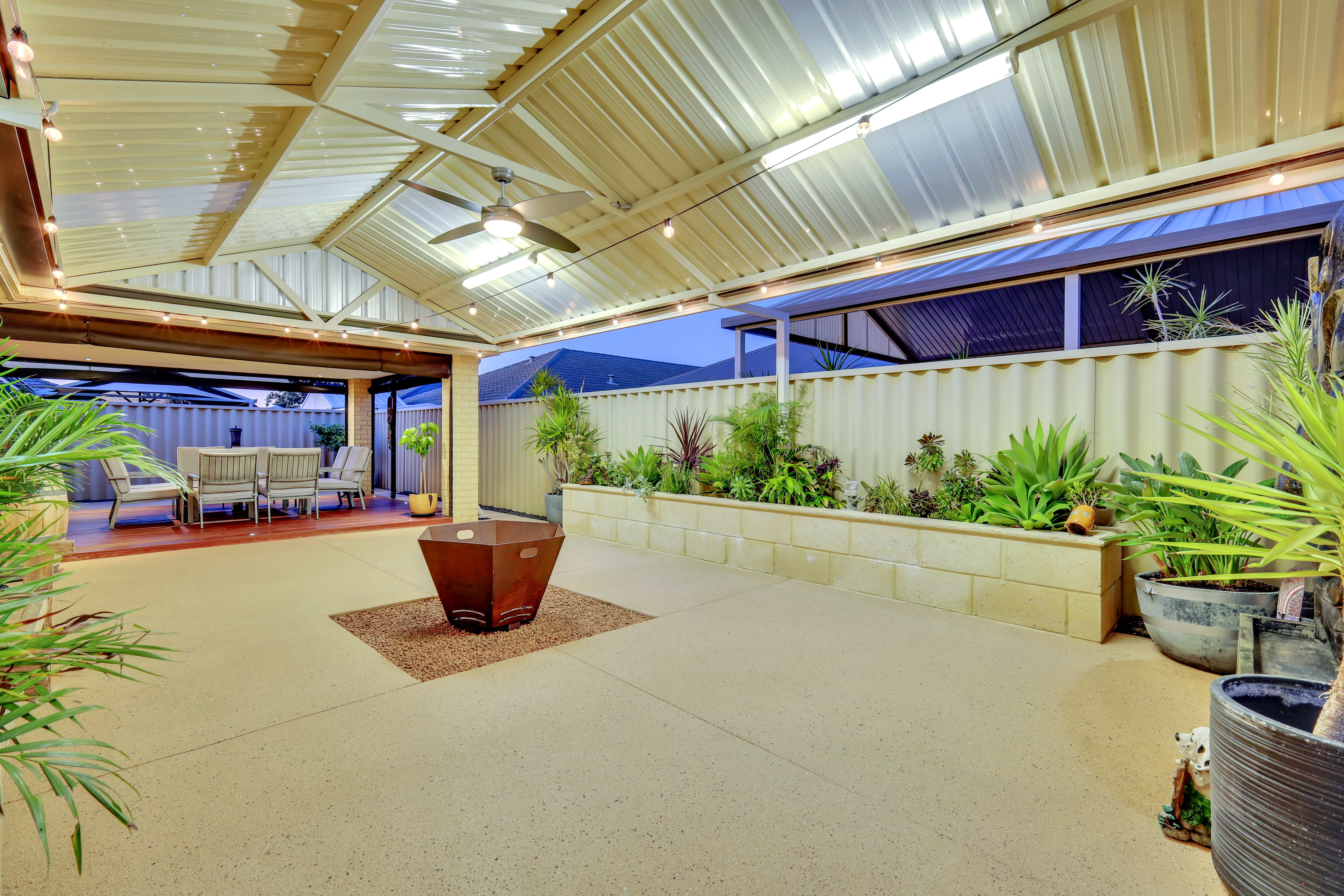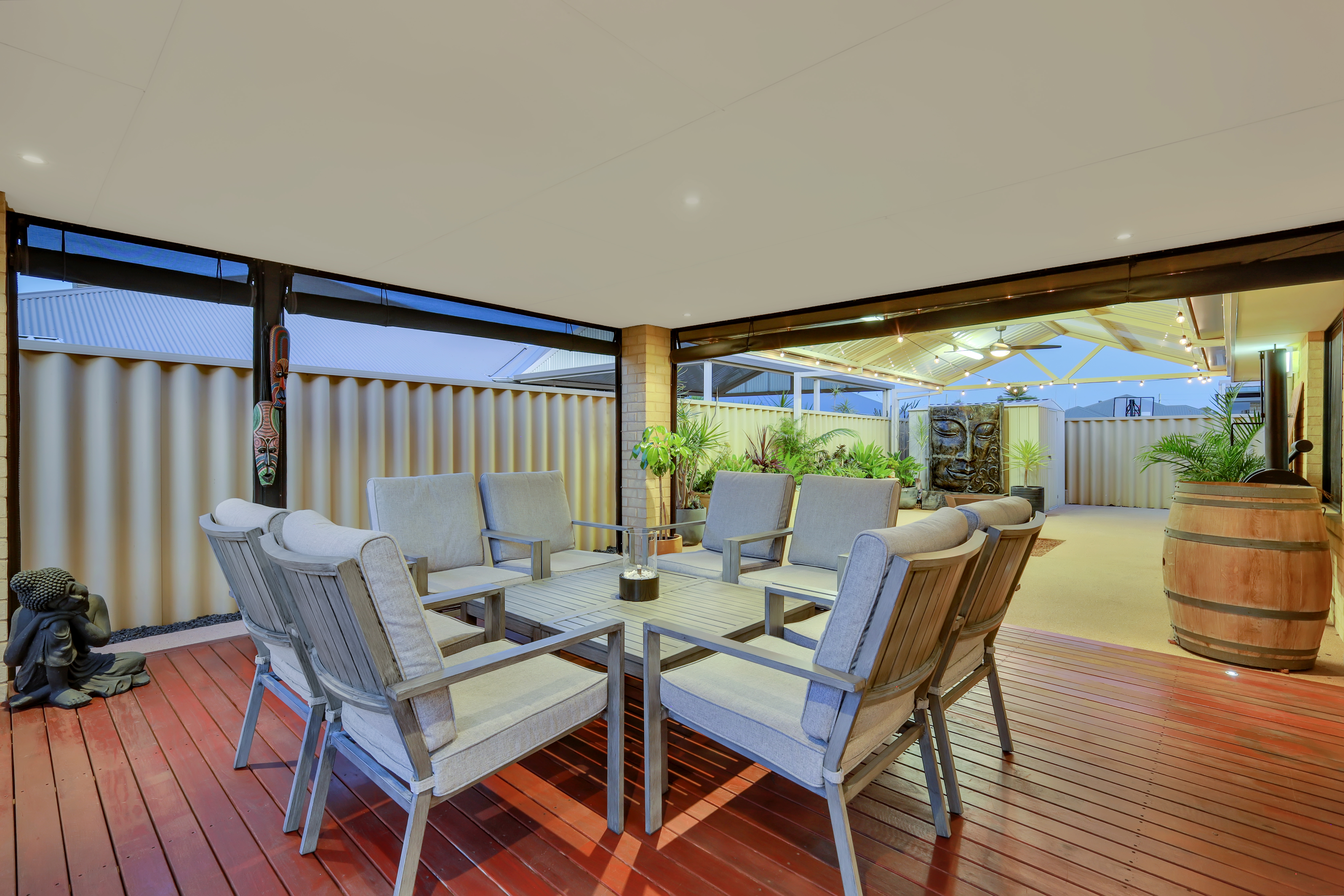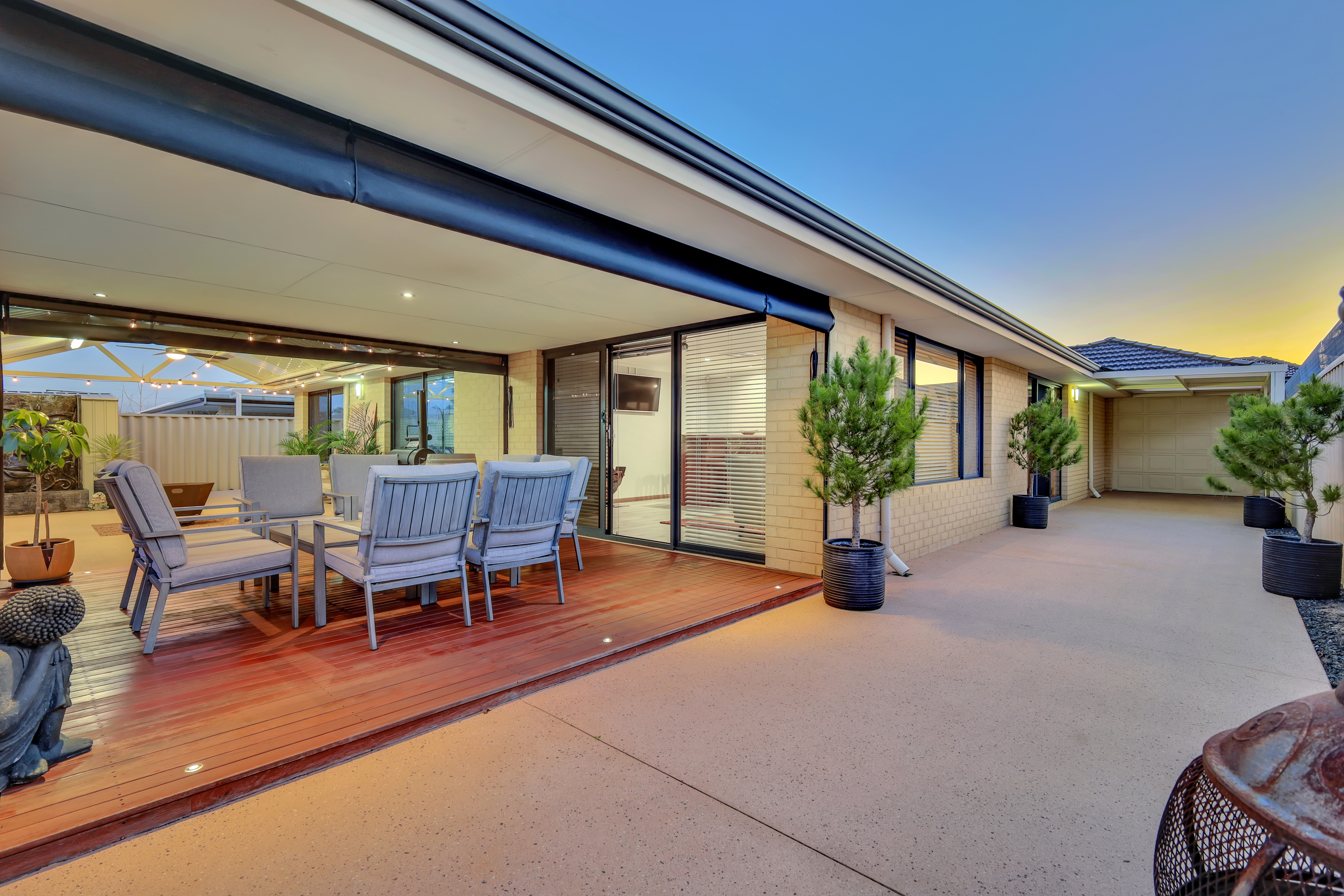 Beautiful, Well-Maintained Outdoor Area The outdoor area combines style and functionality, offering an inviting space perfect for both relaxation and entertainment. The alfresco area boasts elegant wooden decking, creating a warm and welcoming ambience. Equipped with roll-down blinds, it allows for year-round outdoor enjoyment. This covered alfresco extends into a spacious patio, ideal for hosting gatherings or enjoying quiet family meals. The surrounding well-maintained garden beds and a serene water feature add a natural touch, while the expansive layout provides ample room for outdoor furniture, barbecues, or even a play area for children.