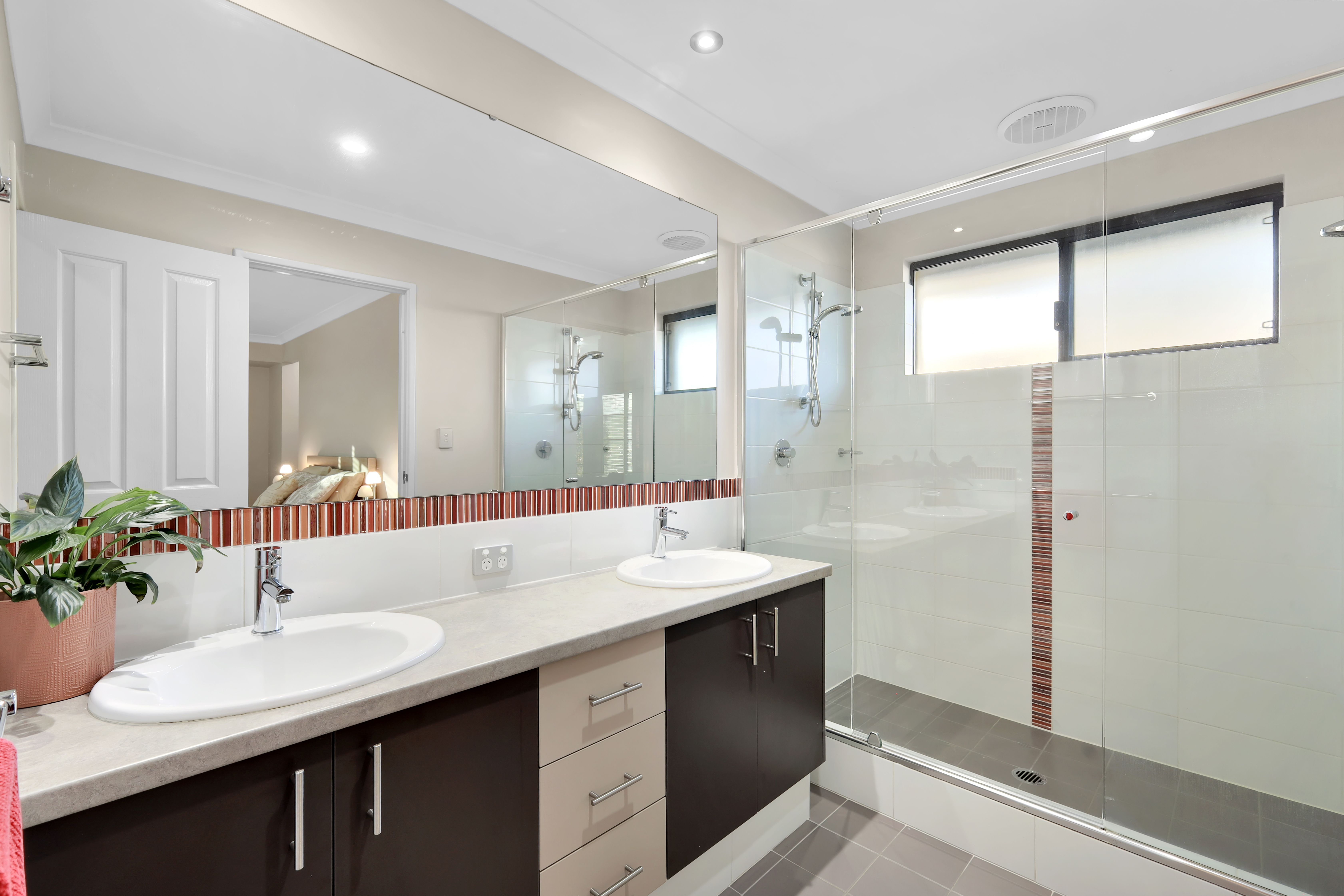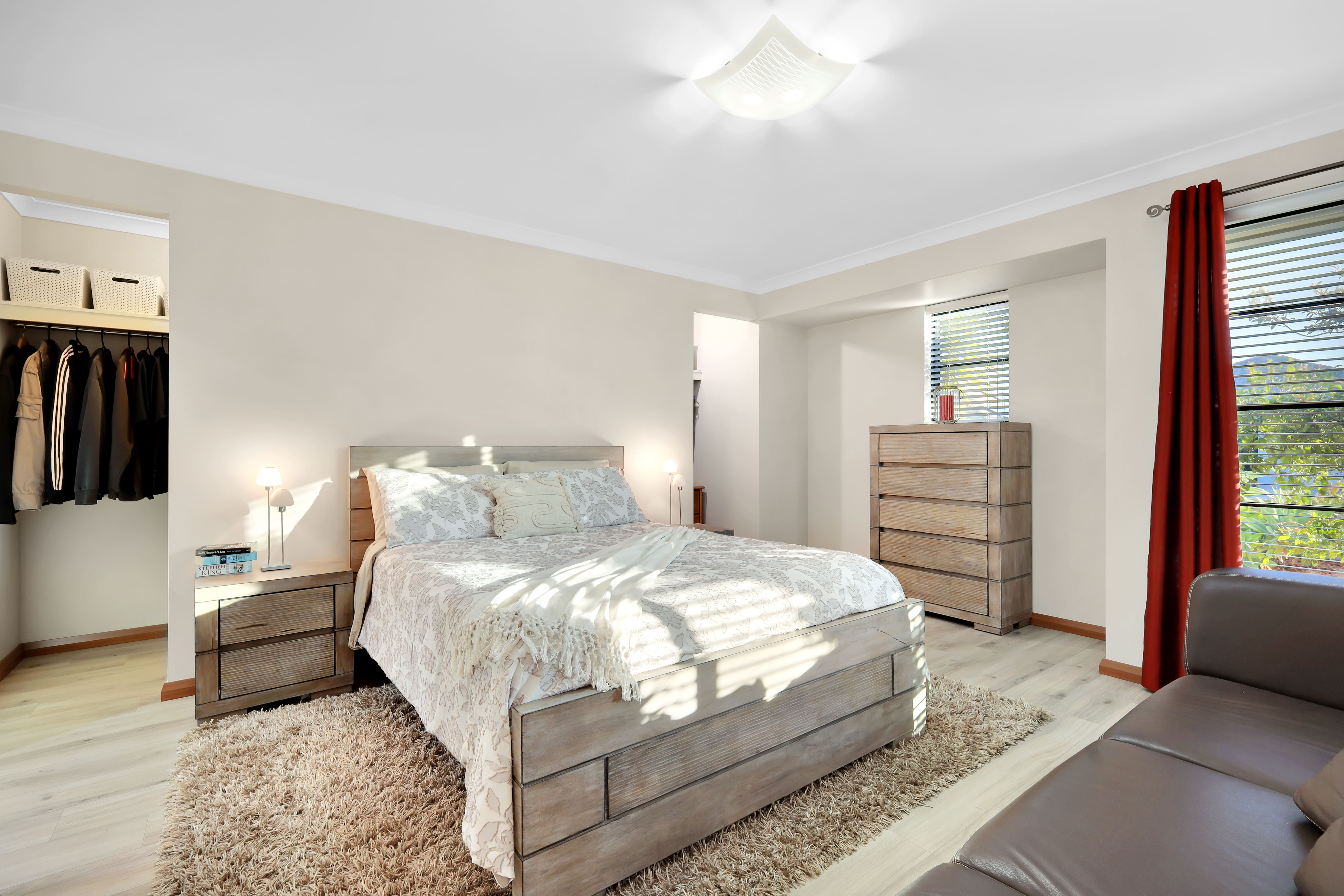 The master bedroom is a tranquil retreat, offering privacy and comfort with its ensuite and custom his-and-her robes. Spacious and elegantly designed, this serene haven perfectly combines luxury and practicality, creating an ideal space for relaxation. The ensuite features a double vanity, stone benchtop, extended shower, and a separate toilet, adding to the room's sophisticated appeal.